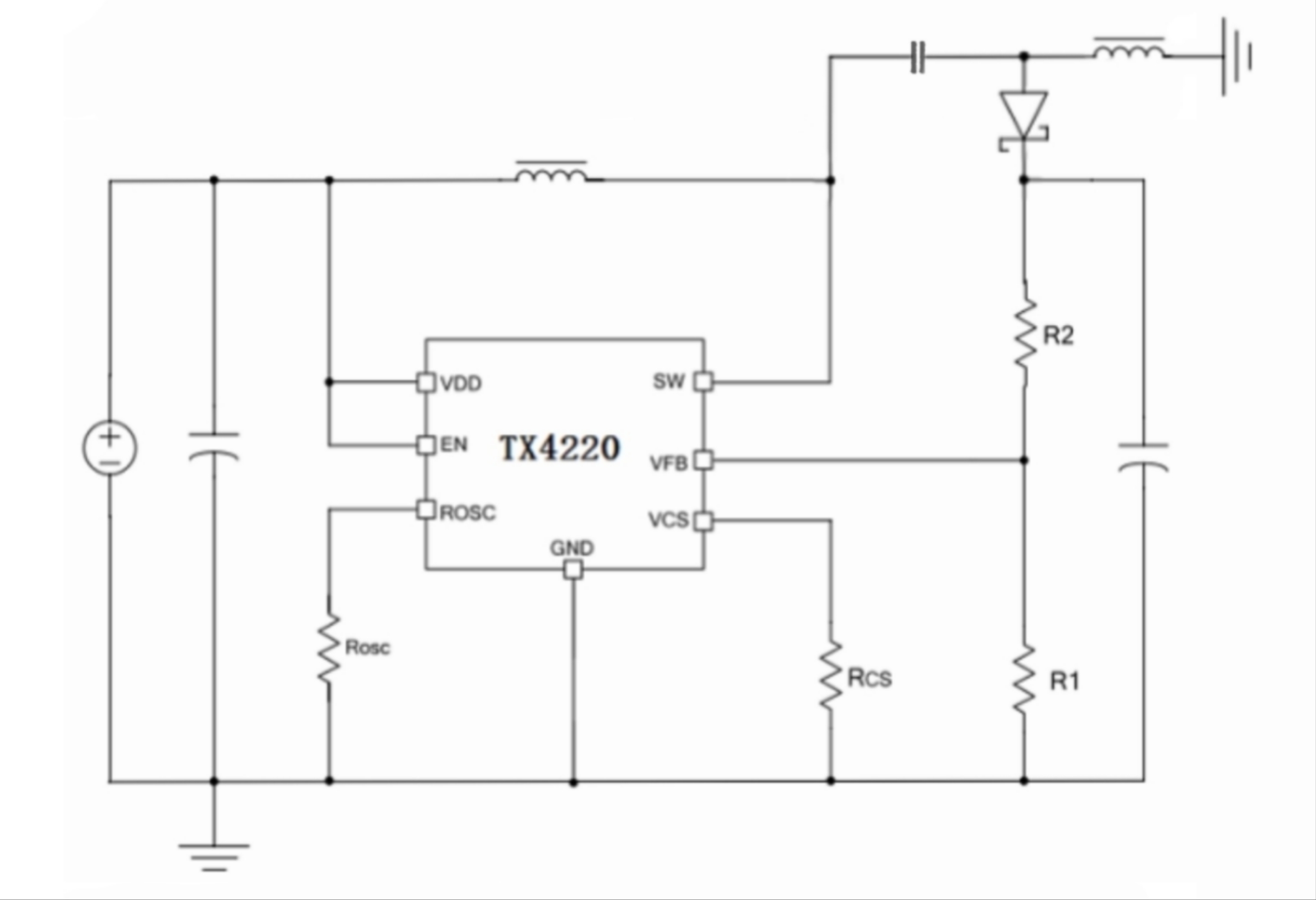 TX4220 典型应用支持 5-36V 输入电压范围。输出电压< 100V。