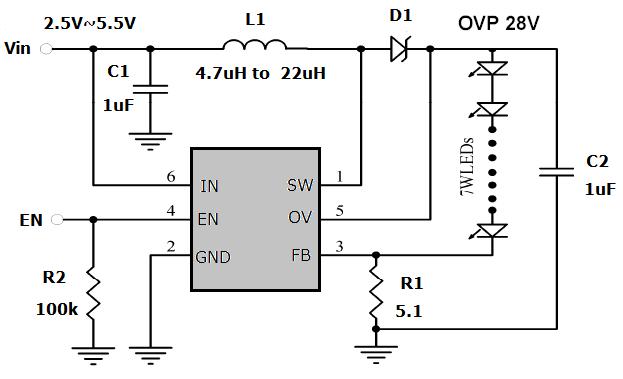 TX6216是一款升压转换器,设计用于通过单节锂离子电池驱动多达7个串联的白光LED。
